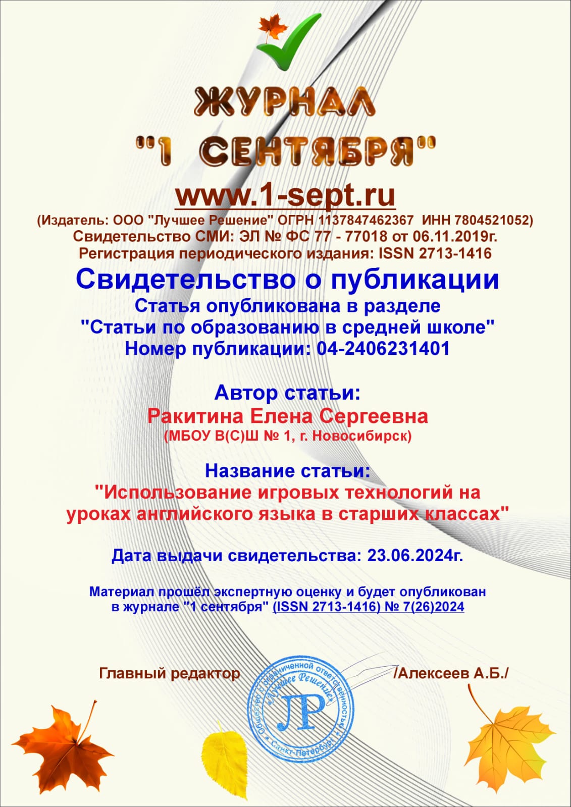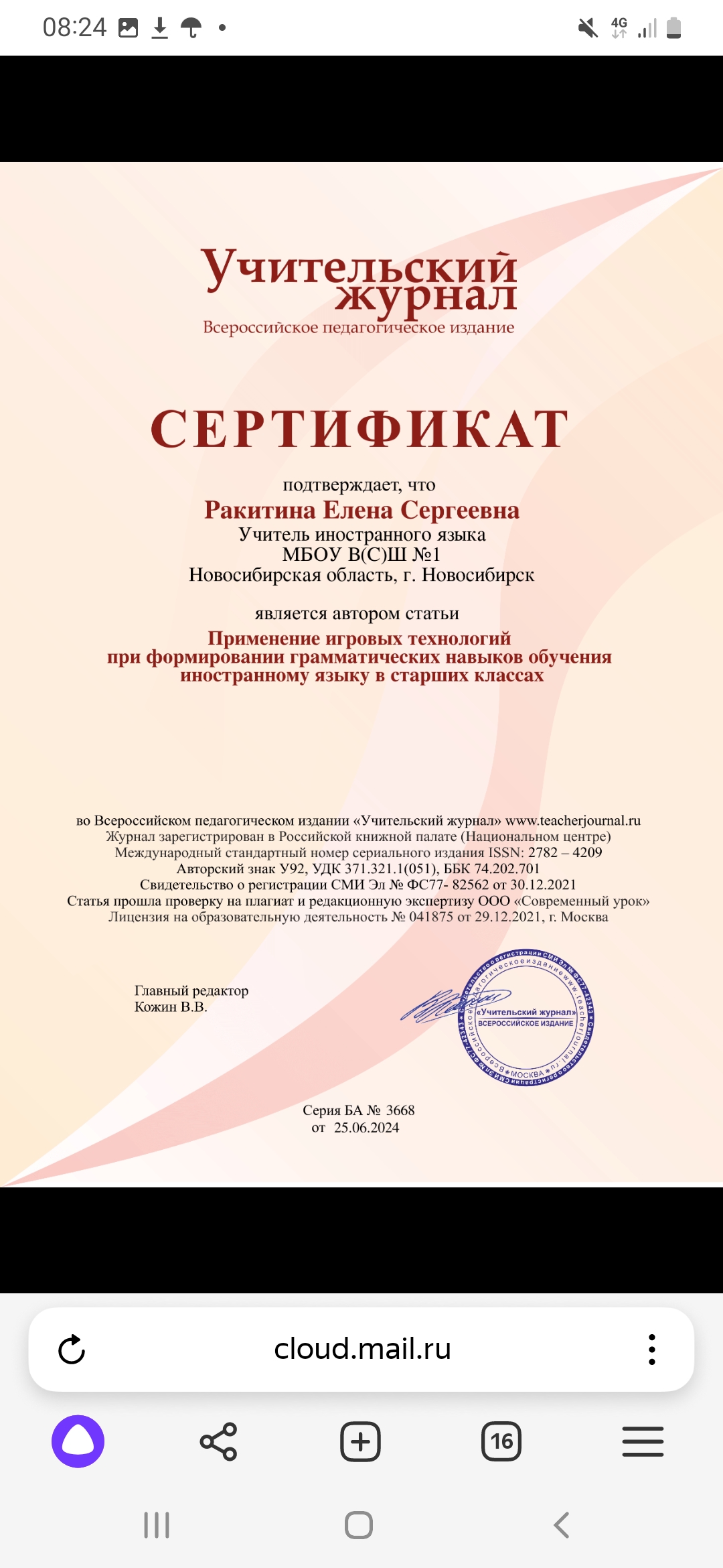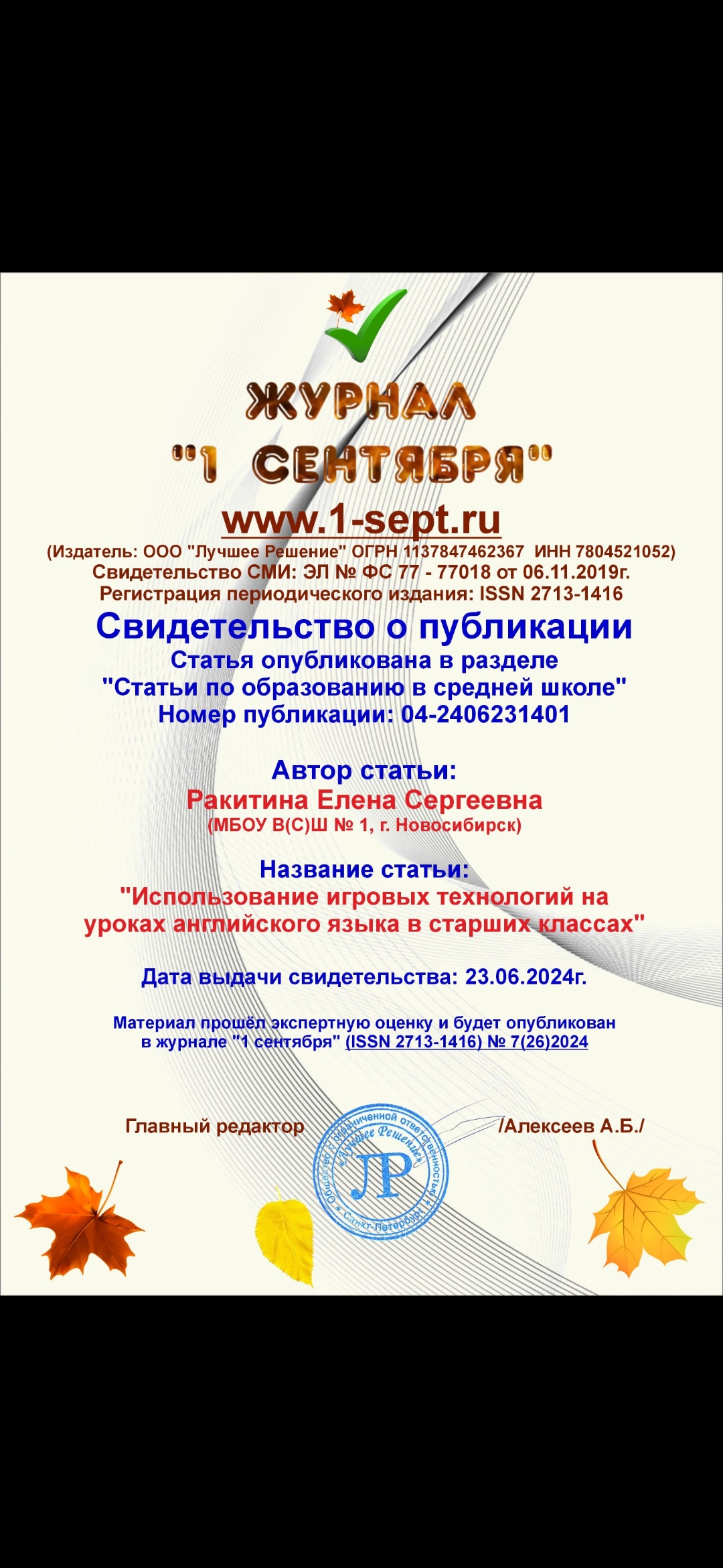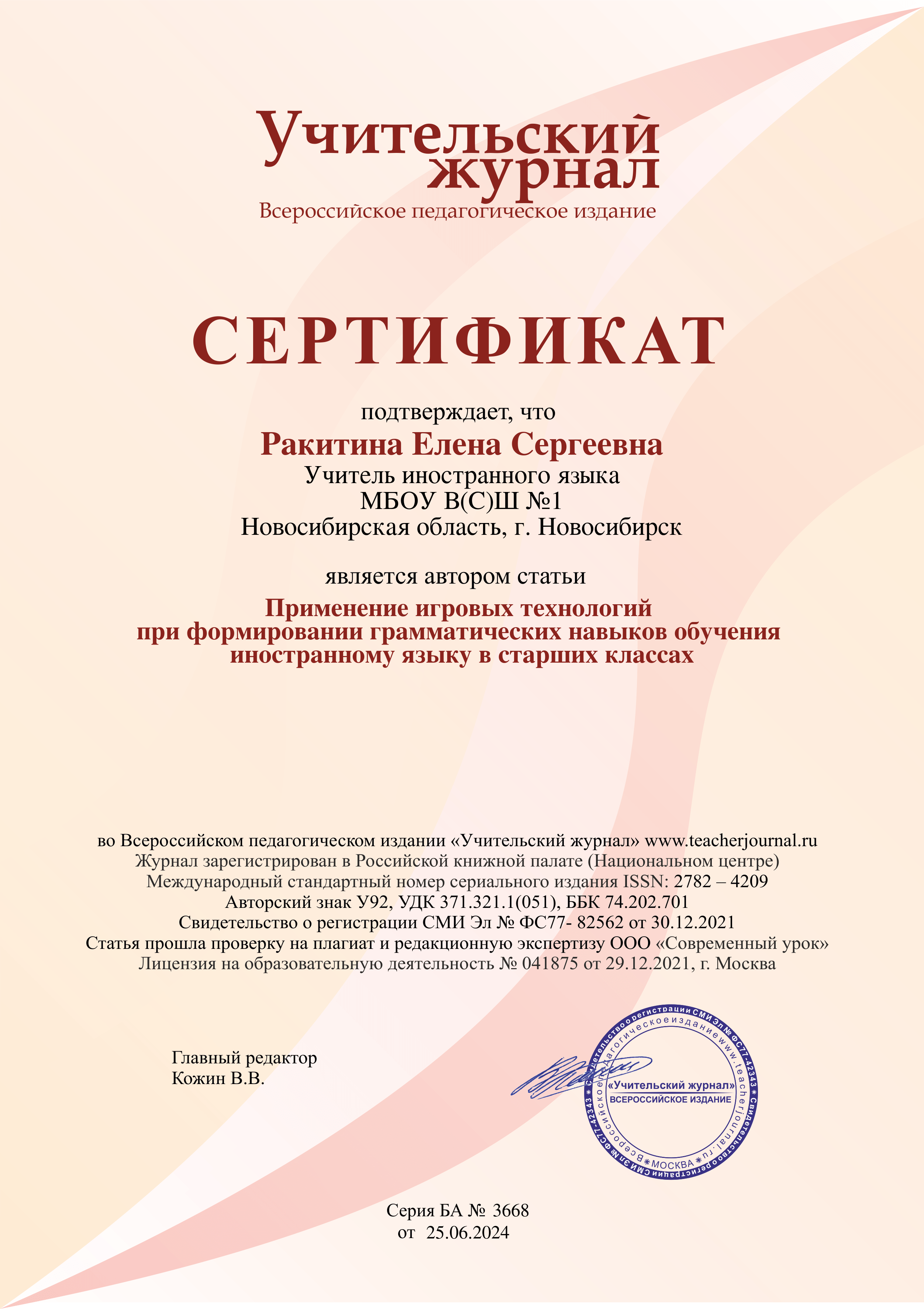 "Применение игровых технологий на уроках английского языка при формировании грамматических навыков обучении в старших классах": Публикация . Учительский журнал . - 2024.