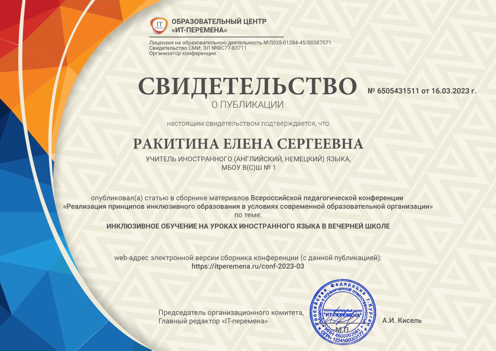 "Инклюзивное обучение на уроках иностранного языка в вечерней школе" // №6505431511 от 16.03. 2023, 2023.
