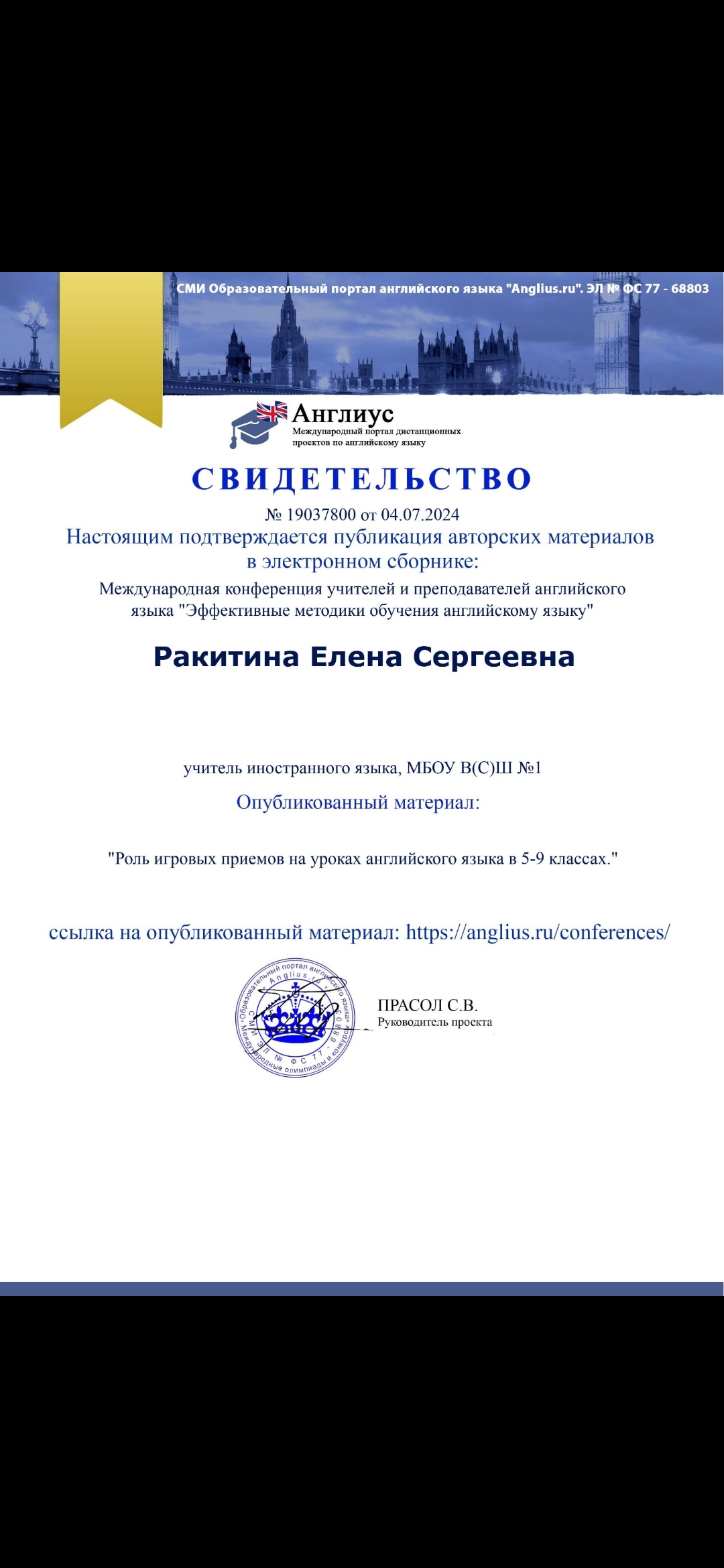 "Эффективные методики обучения английскому языку" Роль игровых приёмов на формирование коммуникативной компетенции на уроках английского в 5-9 классах : Конференция . Электронный сборник авторских работ на сайте Англиус. - 2024.